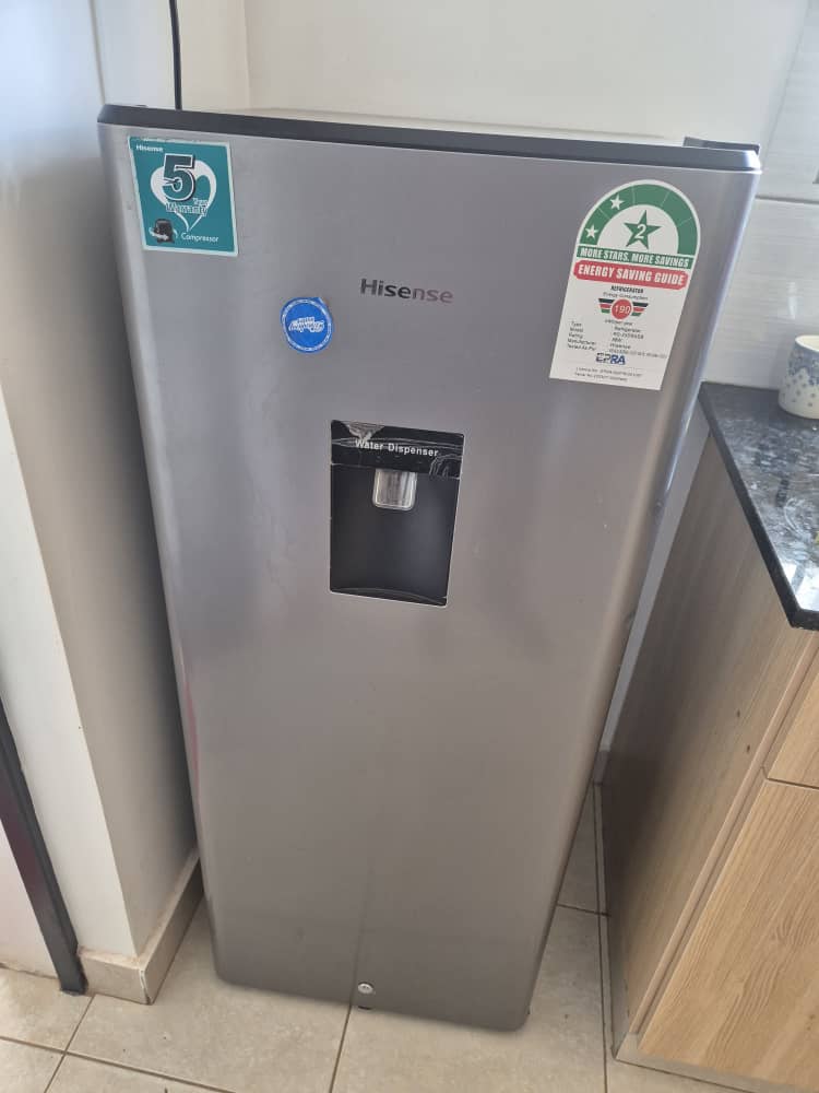 Buy this Clean 185L Hisense Single Door Fridge today and transform your kitchen experience. It features a convenient water dispenser built right into the door, ensuring you always have chilled water available without opening the main compartment. With a generous net capacity of 185 litres, there is ample space for all your groceries and beverages. The appliance operates with low noise, maintaining a peaceful environment in your home. Its compact yet efficient design makes it a perfect fit for any modern kitchen, offering reliability and convenience in one sleek unit. This very clean and well-maintained unit is ready for immediate use.