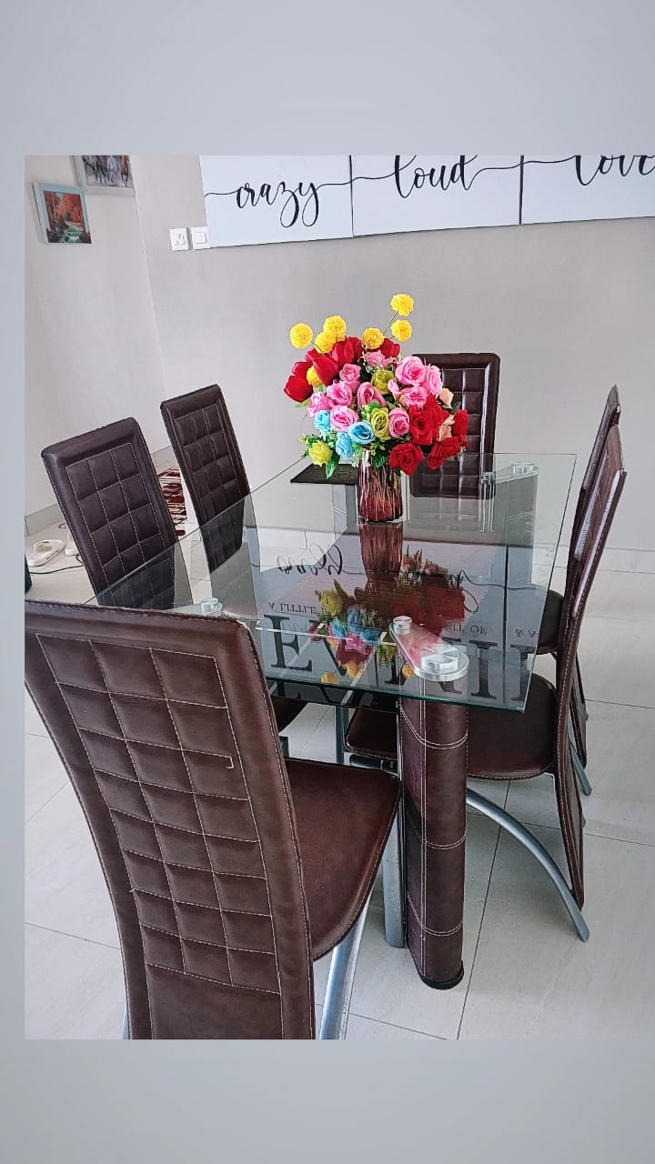 - Get this Stylish Glass Top 6-Seater Dining Table Set.