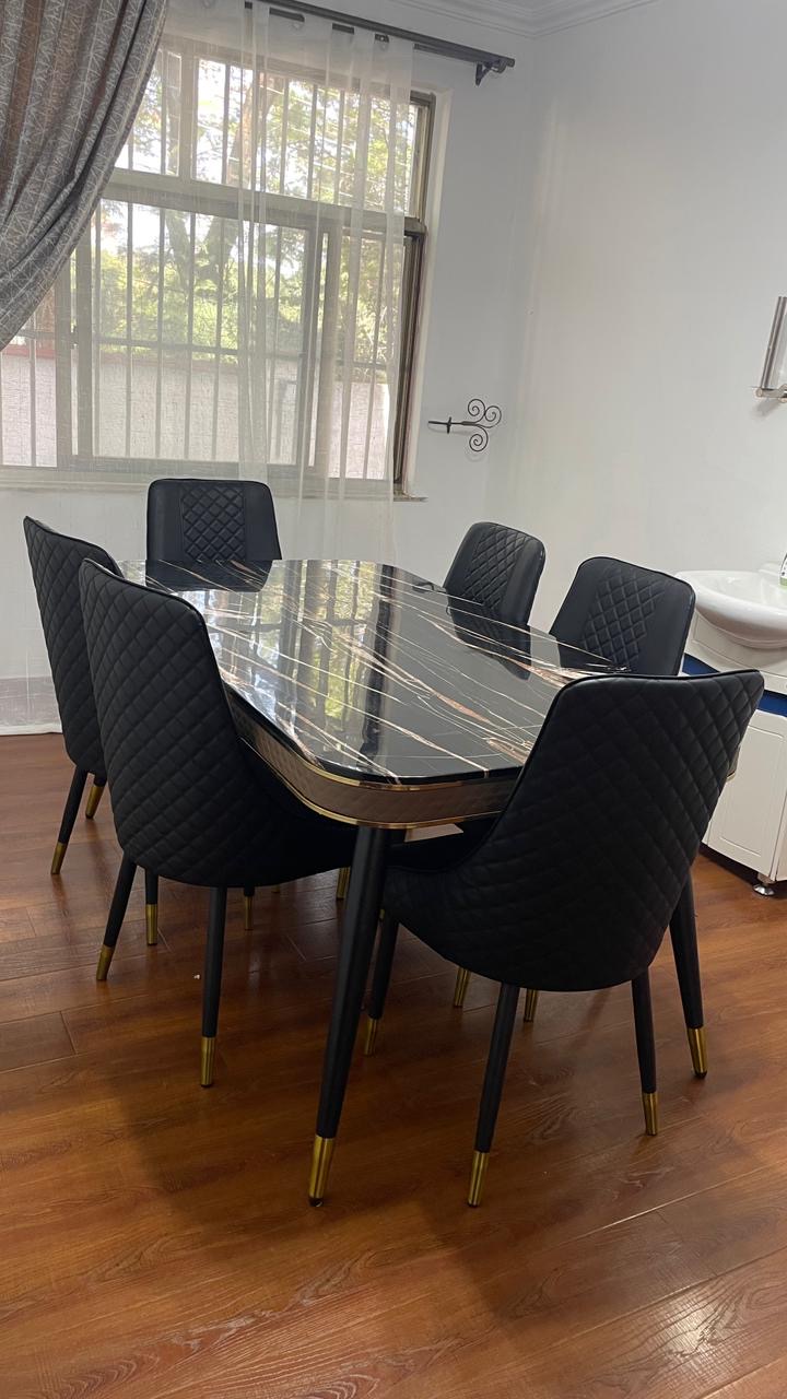 This Modern Luxury Marble Top 6 Seater Dining Set is designed for a centerpiece for a modern luxury home, combining premium materials with refined contemporary style. The focal point is a deep black marble tabletop with subtle natural veining, resting on a sculptural gold finish base that brings warmth and visual richness to the space. Paired with six beautifully upholstered chairs featuring matching gold accent frames, this set strikes a balance between bold aesthetics and comfortable functionality.