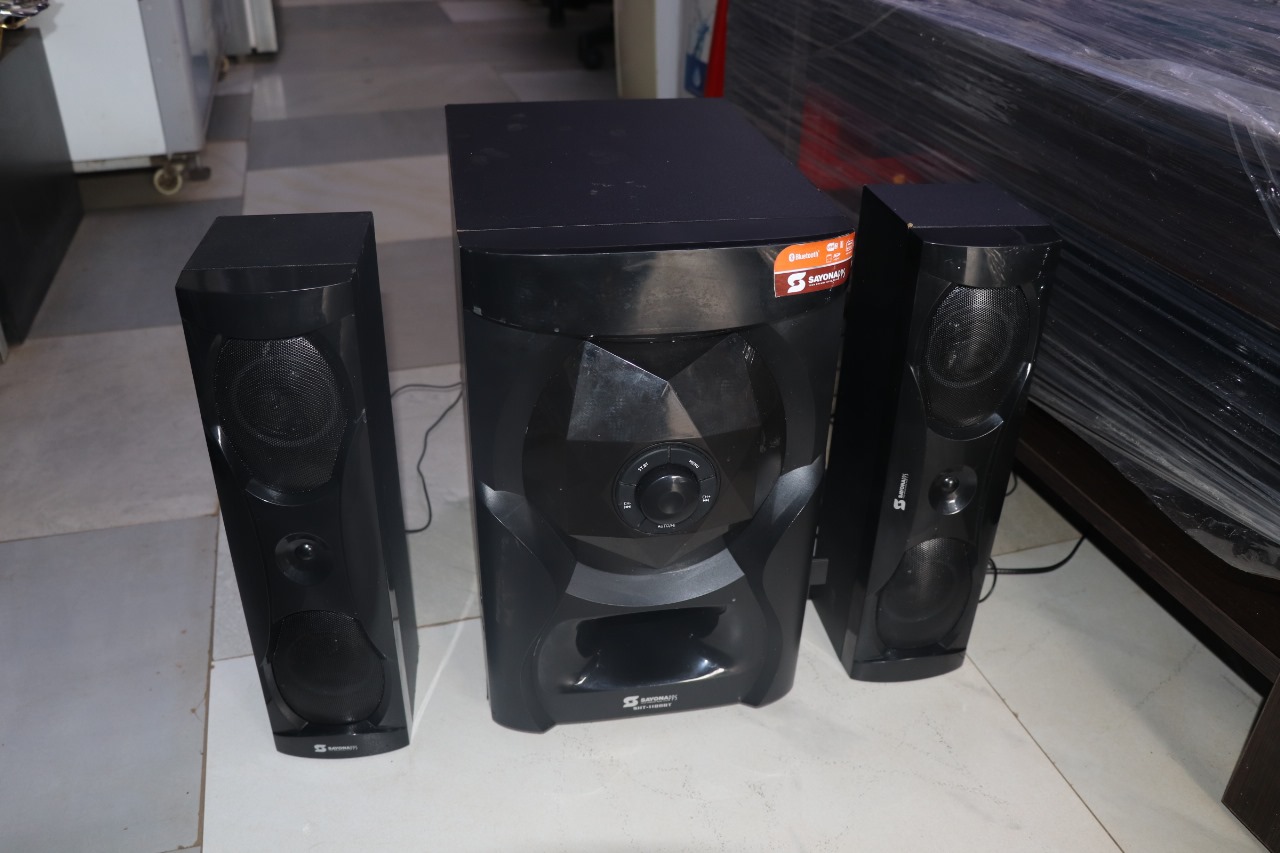 This speaker system is a 2.1 channel set up, which includes a central subwoofer and two satellite speakers.