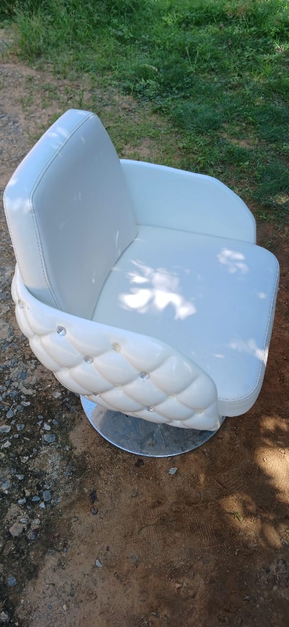 Selling a pair of elegant USED CERAMIC SALON SEATS FOR SALE that are just 2 months old and still in great condition. These stylish chairs features a diamond-tufted design with embedded crystal accents, a comfortable cushioned backrest, and a sturdy chrome base with an adjustable height mechanism. Perfect for a salon, beauty studio, or home setup.